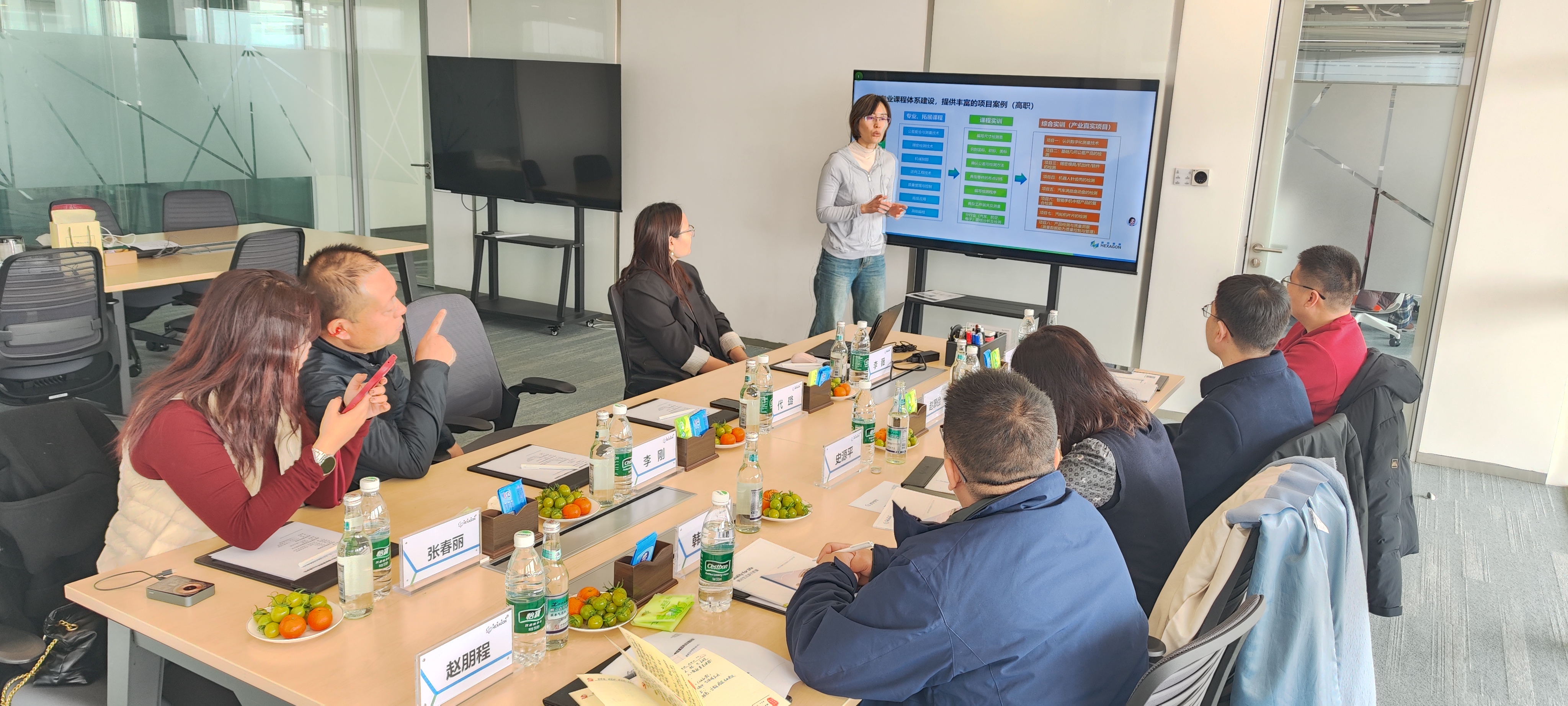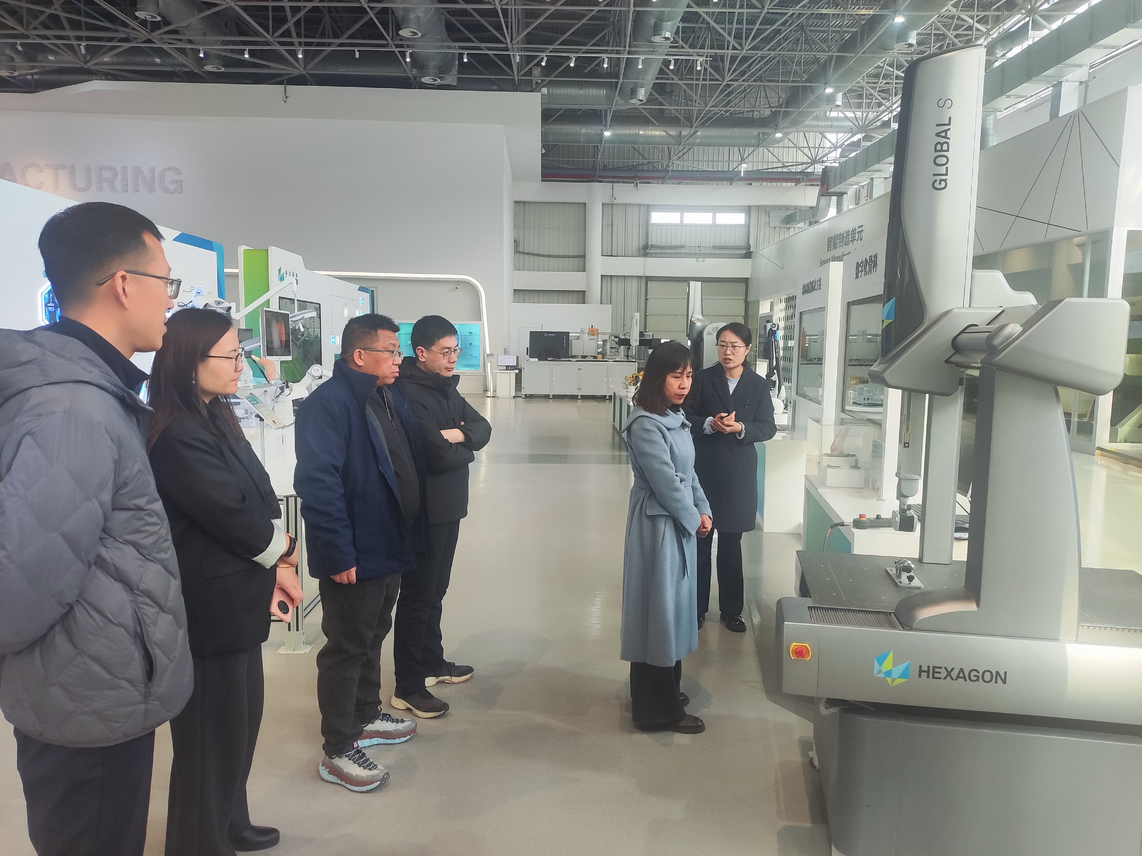 在海克斯康人力资源经理李薇等人的陪同下,访问团参观了企业展厅。通过讲解,学院一行深入了解了海克斯康在“智能制造+工业互联网”领域的战略布局,企业先进的测量技术及在航空航天、汽车制造等领域的广泛应用,给访问团留下了深刻印象。