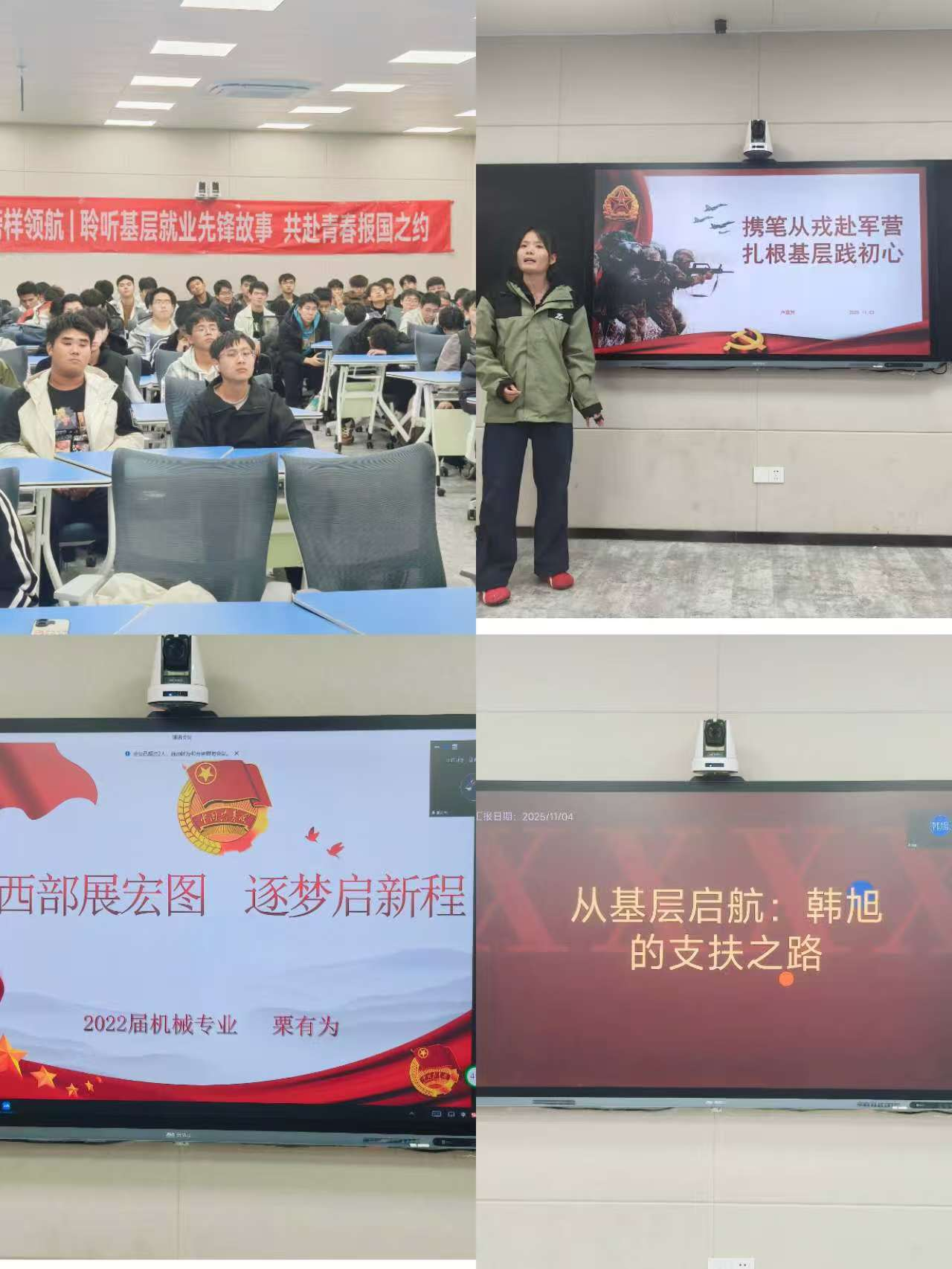 11月4日,机电学院在2号楼329智慧教室成功举办了一场别开生面的“榜样领航”基层就业先锋故事分享会,主题为“聆听基层就业先锋故事,共筑青春报国之梦”。2025级机械设计制造及其自动化专业全体学生参加。
