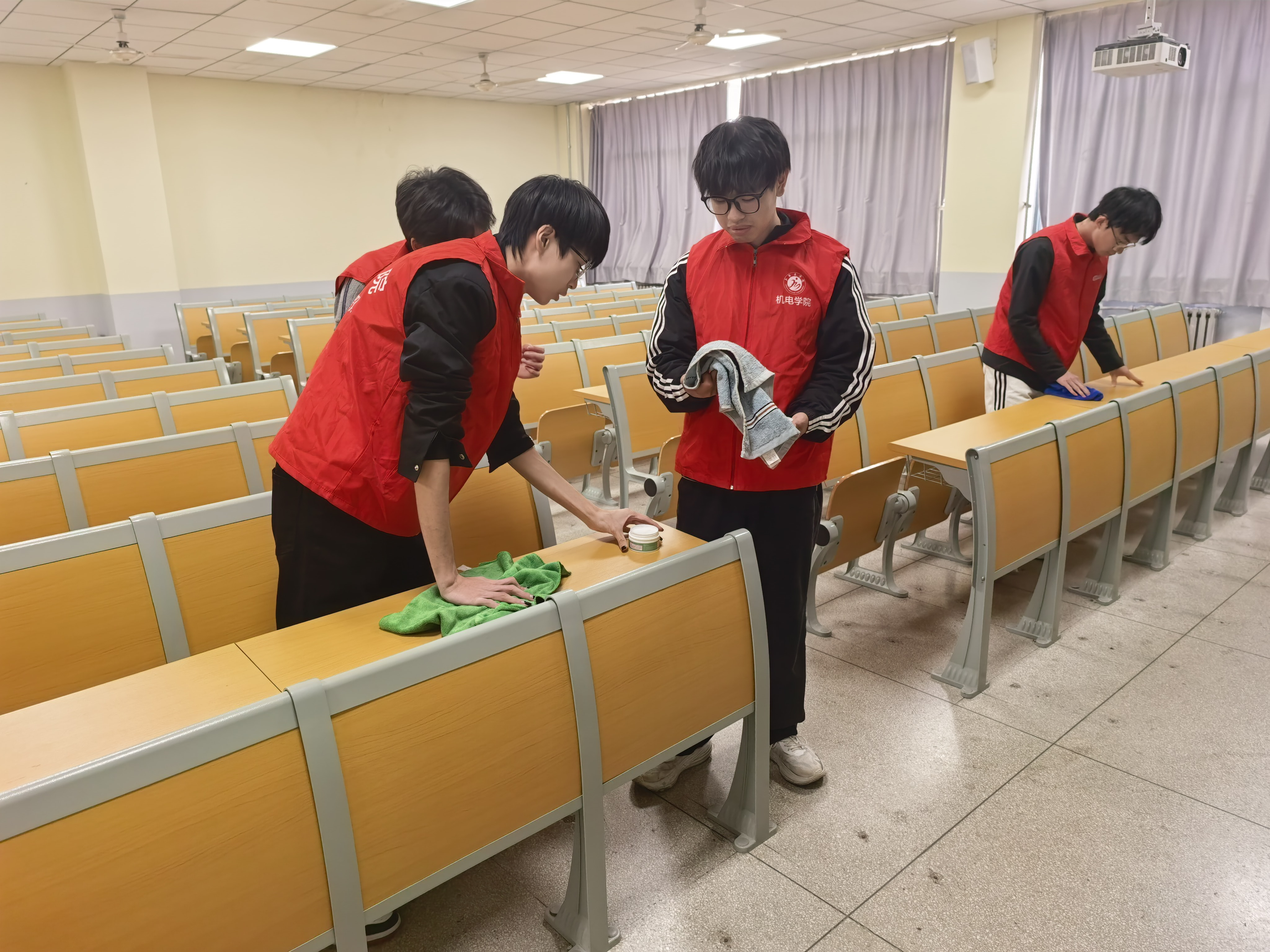 在活动现场,志愿者们分工明确、配合默契,充分展现了电气学子严谨细致、团结协作的专业素养。大家俯身擦拭课桌、清理抽屉杂物、擦拭黑板与门窗,不放过任何一处卫生死角。针对课桌上的顽固污渍、涂鸦,同学们耐心细致地反复擦拭,让原本斑驳的桌面焕然一新;对于地面的纸屑、灰尘,大家认真清扫,确保教室环境窗明几净、井然有序。